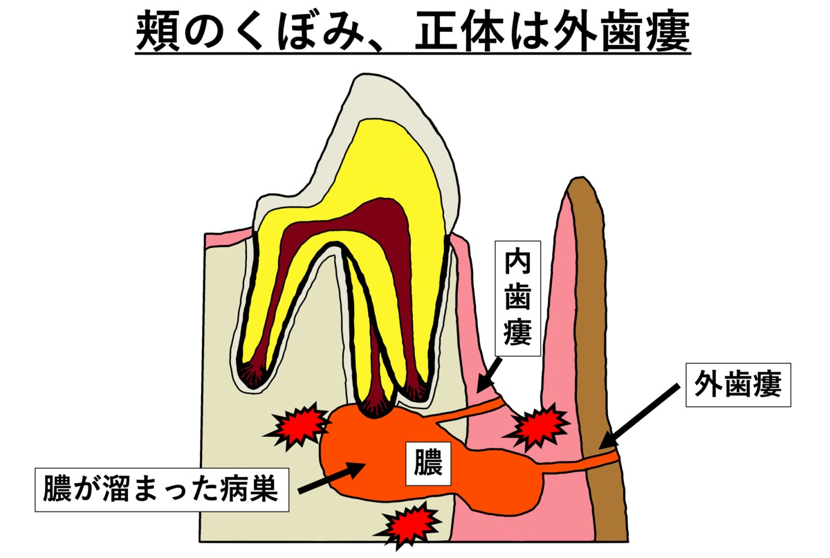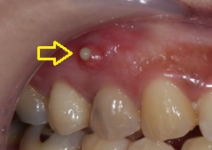 만약 농이 계속 쌓이는 만성 치근단 농양 (慢性歯根端膿瘍、Chronic Apical Abscess) 상태가 지속되면, 치근 주변을 감싸는 뼈가 서서히 녹게 되며, 결국 농이 뼈를 감싸고 있는 잇몸까지 뚫고 나오게 되는 것입니다.